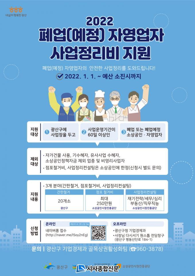 À̹ø »ç¾÷Àº ±¤»ê±¸°¡ Áö³ÇغÎÅÍ ÃßÁøÇÑ ¡®»çÀå´Ô ´Ù½Ã¼±â »ç¾÷¡¯ÀÇ ÀÏȯÀ¸·Î, Äڷγª19 Àå±âÈ µîÀ¸·Î ¾î¿ ¼ö ¾øÀÌ Æó¾÷À» °áÁ¤ÇÑ ÀÚ¿µ¾÷ÀÚÀÇ ¡®½ÇÆÐ ºñ¿ë¡¯ ºÎ´ãÀ» ÁÙ¿©ÁÖ±â À§ÇÑ ÃëÁö·Î ¸¶·ÃµÆ´Ù. ´ë»óÀº ±¤»ê±¸¿¡ »ç¾÷ÀåÀ» µÎ°í 60ÀÏ ÀÌ»ó ¿µ¾÷ÇÏ´ø Áß Æó¾÷Ç߰ųª Æó¾÷À» ¾ÕµÐ ¼Ò»ó°øÀÎÀÌ´Ù.