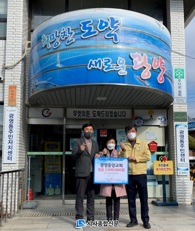 | ±¤¾ç½Ã ±¤¿µÁß¾Ó±³È¸, ºÒ¿ìÀÌ¿ôµ½±â ¼º±Ý Àü´Þ ±¤¿µµ¿¿¡ ÀÌ¿ô»ç¶û ¼º±Ý 200¸¸ ¿ø ±âºÎ |