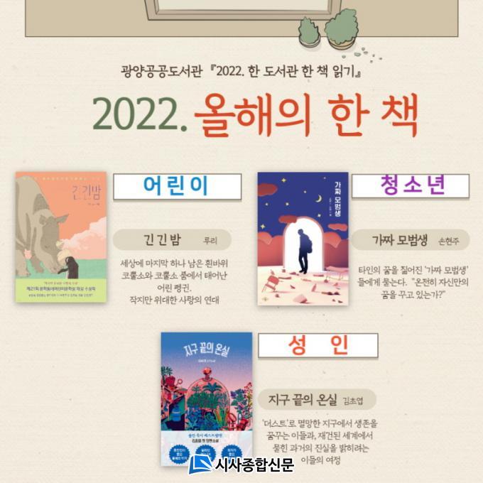 ¡¸2022. ¿ÃÇØÀÇ ÇÑ Ã¥¡¹ ¼±Á¤Àº Àü¶ó³²µµ±³À°Ã» ¼Ò¼Ó °ø°øµµ¼°ü¿¡¼ ¿î¿µÇÏ´Â 'ÇÑ µµ¼°ü ÇÑ Ã¥ Àбâ' »ç¾÷ ÃßÁøÀ» À§ÇÑ °ÍÀ¸·Î, ¼±Á¤µÈ µµ¼¸¦ ÇÔ²² Àаí Åä·Ð ¹× °øÀ¯¸¦ ÅëÇØ °èÃþ °£, ¼¼´ë °£ °ø°¨´ë¸¦ Çü¼ºÇϰí Áö¿ª¹ÎÀÇ µ¶¼ Ȱµ¿À» Àå·ÁÇϱâ À§ÇÑ ¸ñÀûÀÌ ÀÖ´Ù.