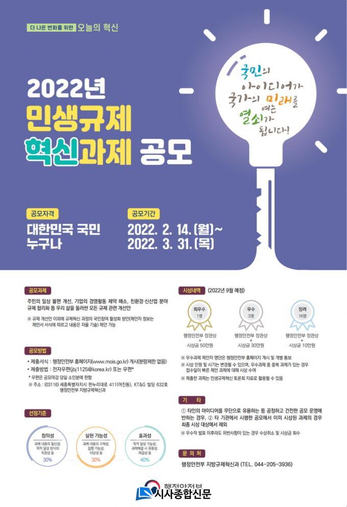 À̹ø °ø¸ðÀüÀº ½Ã¹ÎÀÇ ÀÏ»ó»ýȰÀ̳ª ±â¾÷ÀÇ °æ¿µÈ°µ¿¿¡ ºÒÆíÀ» ÁÖ´Â ºÒÇÕ¸®ÇÑ ±ÔÁ¦¸¦ ¹ß±¼Çϰí ÇØ¼ÒÇϱâ À§ÇØ ¡®±¹¹ÎÀÇ ¾ÆÀ̵ð¾î°¡ ±¹°¡ÀÇ ¹Ì·¡¸¦ ¿©´Â ¿¼è°¡ µË´Ï´Ù¡¯´Â ÁÖÁ¦·Î ¿À´Â 3¿ù 31ÀϱîÁö ÁøÇàµÈ´Ù.