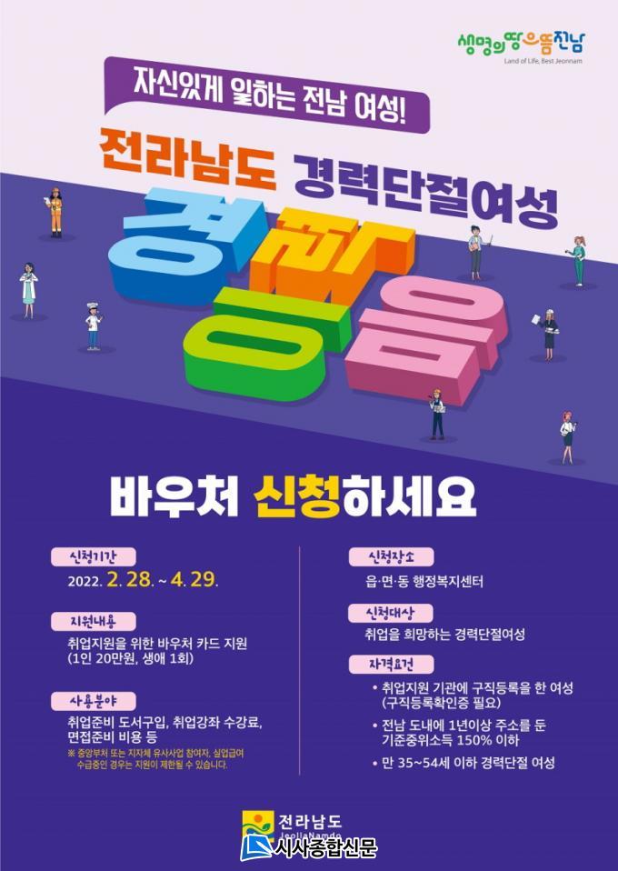 ½ÅûÀÚ°ÝÀº Àü¶ó³²µµ¿¡ 1³â ÀÌ»ó ÁÖ¼Ò¸¦ µÐ ¸¸35¼¼ºÎÅÍ 54¼¼±îÁöÀÇ °æ·Â´ÜÀý¿©¼ºÀ¸·Î, Àü¿ù °Ç°º¸Çè·á°¡ ±âÁØ ÁßÀ§¼Òµæ 150% ÀÌÇÏÀÌ¸é ½Åû°¡´ÉÇÏ´Ù. Áö¿øÈñ¸ÁÀÚ´Â ±¸Á÷µî·ÏÈ®ÀÎÁõ µî ±¸ºñ¼·ù¸¦ °®Ãç ¿À´Â 4¿ù 29ÀϱîÁö °ÅÁÖÁö À¾¸éµ¿ ÇàÁ¤º¹Áö¼¾ÅÍ¿¡¼ ½ÅûÇÒ ¼ö ÀÖÀ¸¸ç, ¼±Á¤µÈ ÈÄ¿¡´Â NH³óÇùÀºÇà ¼øÃµ½ÃÁöºÎ(¿¬Ç⵿ ¼ÒÀç)¿¡¼ Ä«µå¸¦ ¹ß±Þ ¹Þ¾Æ »ç¿ëÇÒ ¼ö ÀÖ´Ù.