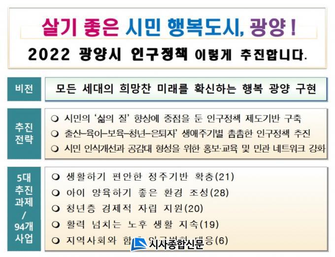 ±¤¾ç½Ã´Â Àü±¹ÀûÀÎ ÃÊÀúÃâ»ê°ú °í·ÉÈ·Î ÀÎÇØ °¡¼Óȵǰí ÀÖ´Â Àα¸±¸Á¶ º¯È¿¡ ¼±Á¦ÀûÀ¸·Î ´ëÀÀÇÏ°í ¡®¸ðµç ¼¼´ëÀÇ Èñ¸ÁÂù ¹Ì·¡¸¦ È®½ÅÇÏ´Â Çູ ±¤¾ç ±¸Çö¡¯À» À§ÇØ ¡®Àα¸ À¯ÀÔ°ú À¯Áö¡¯ ÅõÆ®·¢ Àü·«À¸·Î 5´ë °úÁ¦º° 94°³ »ç¾÷À» º»°Ý ÃßÁøÇÒ ¹æÄ§ÀÌ´Ù.