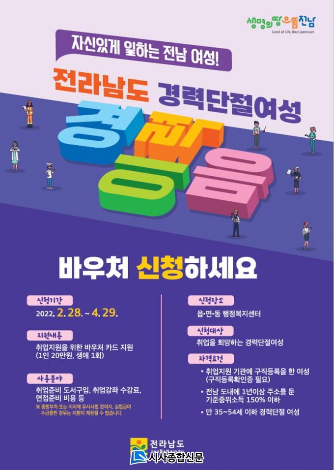 ½Åû´ë»óÀº Ãë¾÷ Áö¿ø±â°ü(¿©¼º»õ·ÎÀÏÇϱ⼾ÅÍ, °í¿ëº¹ÁöÇ÷¯½º¼¾ÅÍ µî)¿¡ ±¸Á÷ µî·ÏÇÑ ¸¸ 35¼¼ ÀÌ»ó 54¼¼ ÀÌÇÏ °æ·Â´ÜÀý ¿©¼ºÀÌ´Ù.½ÅûÀÏ ±âÁØ Àü¶ó³²µµ¿¡ 1³â ÀÌ»ó ÁÖ¼Ò¸¦ µÎ°í, Àü¿ù °Ç°º¸Çè·á°¡ ÁßÀ§¼Òµæ 150% ÀÌÇÏ¸é °¡´ÉÇÏ´Ù. Èñ¸ÁÀÚ´Â 4¿ù 29ÀϱîÁö ÁÖ¼ÒÁö À¾¸éµ¿¿¡ ½ÅÃ»ÇØ¾ßÇϸç, ¼±Á¤µÈ ÈÄ ÁöÁ¤µÈ ³óÇùÀºÇà¿¡¼ Ä«µå¸¦ ¹ß±Þ¹ÞÀ¸¸é µÈ´Ù. ±âŸ ÀÚ¼¼ÇÑ »çÇ×Àº ¿©¼ö½Ã ȨÆäÀÌÁö °í½Ã°ø°í¿¡¼ È®ÀÎÇϰųª ¿©¼º°¡Á·°ú(¢Ï061-659-3745)·Î ¹®ÀÇÇÏ¸é µÈ´Ù.