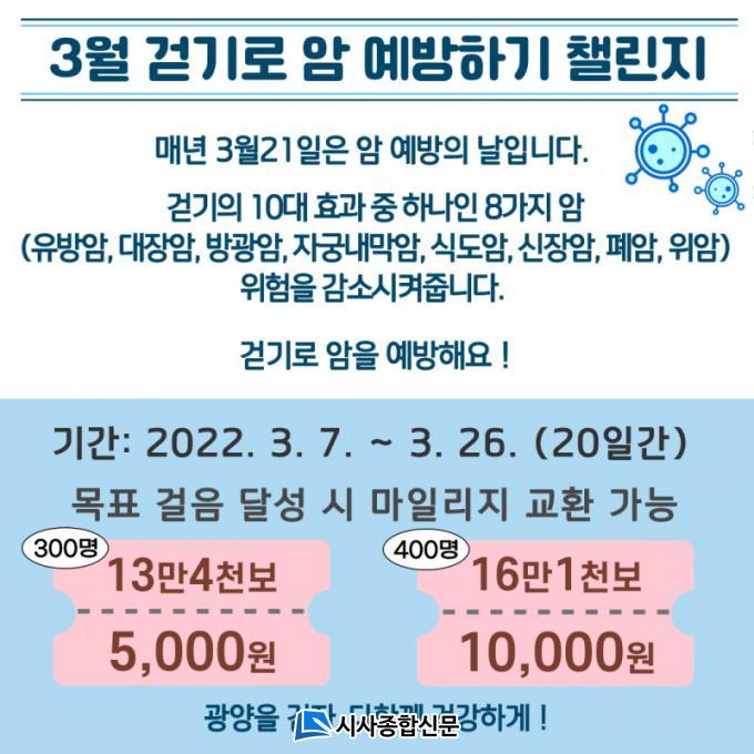 ÇÑÆí, ±¤¾ç½Ã ¼¿µ¿Á °Ç°ÁõÁø°úÀåÀº ¡°¿öÅ©¿Â ¾Ï ¿¹¹æ 縰Áö¸¦ ÅëÇØ ½Ã¹ÎµéÀÌ ½º½º·Î ¾Ï ¿¹¹æ¼öÄ¢À» ½ÇõÇÏ¸ç °Ç°ÇÑ °È±â ¹®È°¡ Á¶¼ºµÇ±æ ¹Ù¶õ´Ù¡±°í ¸»Çß´Ù.Áö¿ªÀº ±¤¾çÀ¸·Î Á¦ÇÑ ¼³Á¤ÇÑ µÚ ¹Ýµå½Ã ÈÞ´ëÆù À§Ä¡¼³Á¤À» ¹Ýµå½Ã ÄÑ¾ß Âü¿©ÇÒ ¼ö ÀÖÀ¸¸ç, ÀÚ¼¼ÇÑ »çÇ×Àº ±¤¾ç½Ãº¸°Ç¼Ò(¢Ï061-797-3797)·Î ¹®ÀÇÇÏ¸é µÈ´Ù.