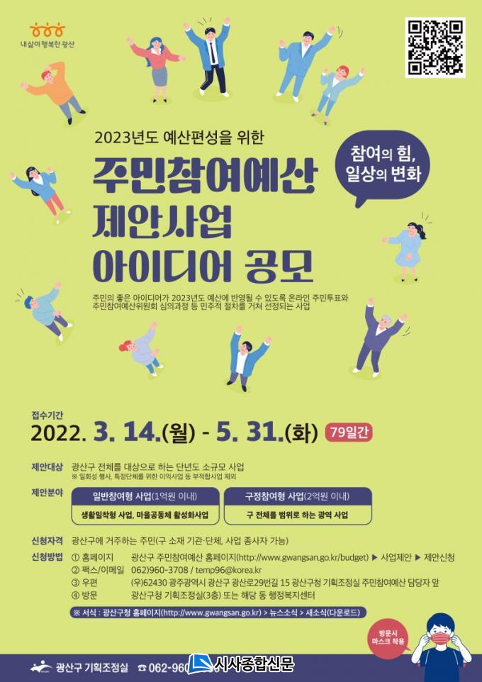 ±¤»ê±¸´Â Á¦¾È»ç¾÷¿¡ ´ëÇØ ºÎ¼ °ËÅä¿Í ÁÖ¹ÎÂü¿©¿¹»êÀ§¿øÈ¸ ½É»ç ¹× ÁÖ¹ÎÅõÇ¥¸¦ °ÅÃÄ ÃÖÁ¾ »ç¾÷À» ¼±Á¤ÇÒ °èȹÀÌ´Ù. ÀÚÄ¡°èȹÇü 8¾ï ¿ø, ÀϹÝÂü¿©Çü 1¾ï ¿ø, ±¸Á¤Âü¿©Çü 2¾ï ¿ø µî ÃÑ 11¾ï ¿øÀÇ ÁÖ¹ÎÂü¿©¿¹»êÀ» ³»³â º»¿¹»ê¿¡ Æí¼ºÇÒ ¹æÄ§ÀÌ´Ù. ÀÌÈÄ ÀÇȸ ¿¹»ê½ÉÀǸ¦ °ÅÃÄ 2023³â ÁÖ¹ÎÂü¿©¿¹»ê »ç¾÷À» È®Á¤ÇÑ´Ù.