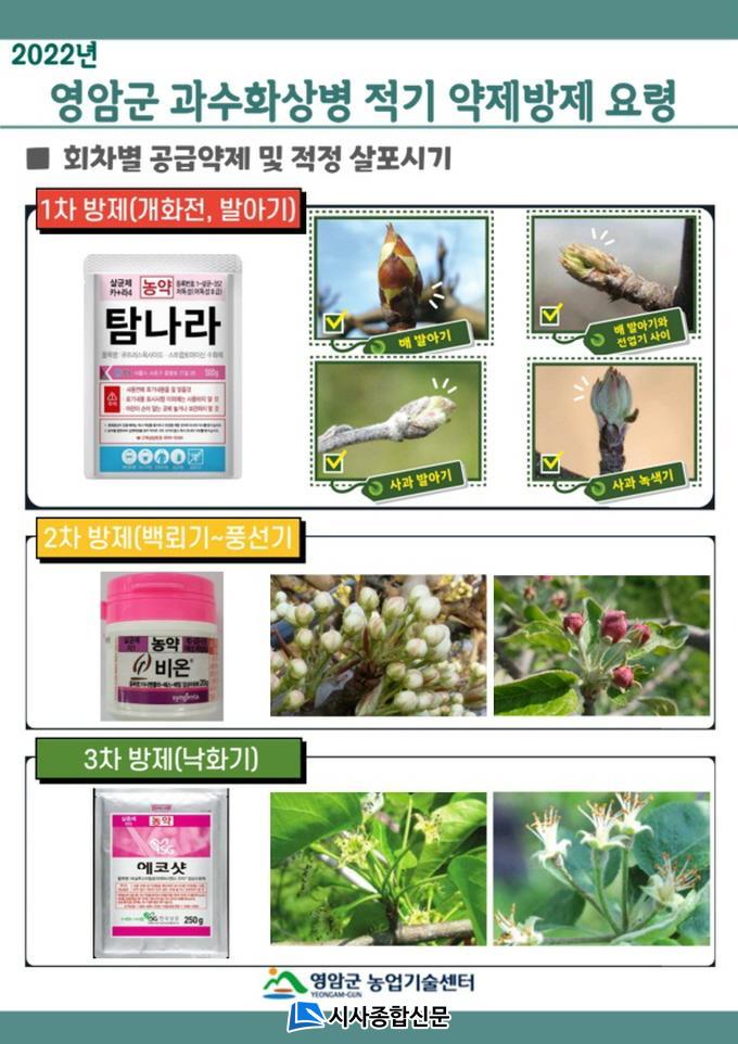 È»óº´ ¹Ì¹ß»ýÁö¿ªÀÎ ¿µ¾Ï±ºÀº ¿ÃÇØºÎÅÍ´Â ÃÑ 3ȸ(°³È Àü 1ȸ, °³È±â 2ȸ)¿¡ °ÉÃÄ »çÀü¹æÁ¦¸¦ ½ÃÇàÇØ¾ß ÇÑ´Ù. 1Â÷ ¹æÁ¦´Â ¹èÀÇ °æ¿ì ²É´« ¹ß¾Æ Á÷ÈÄ 3¿ù Áß¼øºÎÅÍ 3¿ù Çϼø±îÁö, »ç°ú´Â »õ¼ø ¹ß¾Æ ½Ã 3¿ù ÇϼøºÎÅÍ 4¿ù Ãʼø±îÁö ¹æÁ¦ÇØ¾ß ÇÑ´Ù. 2~3Â÷ ¹æÁ¦´Â °¢°¢ dz¼±±â(4¿ù»ó¼ø)¿Í ³«È±â(4¿ùÁß¼ø)¿¡ ¸ÂÃç Àü¿ë ¾àÁ¦¸¦ »ìÆ÷ÇØ¾ß ÇÑ´Ù.
