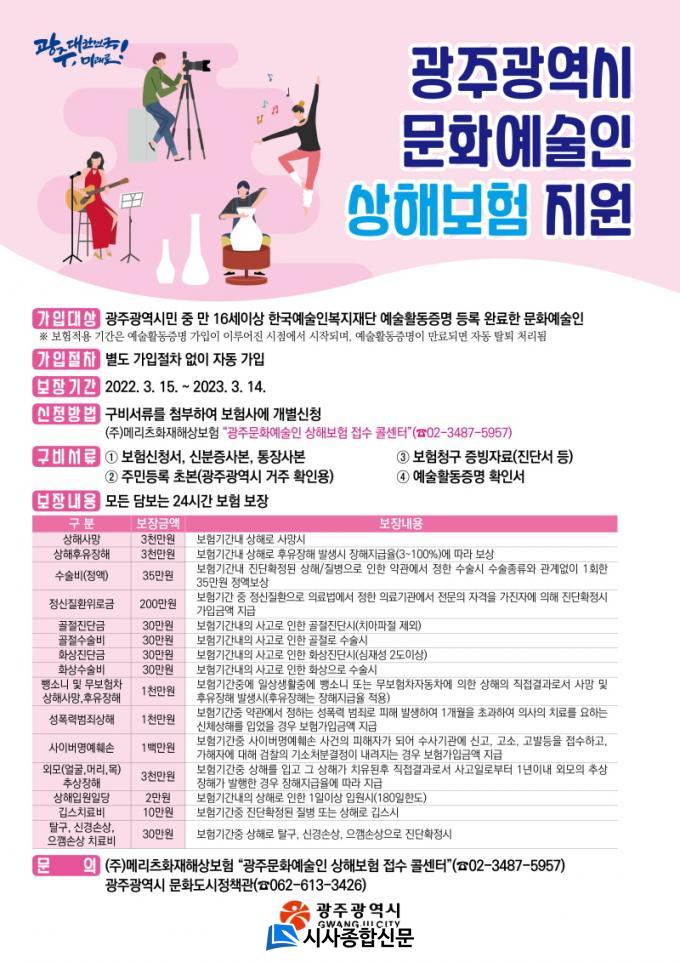 º¸Çè°¡ÀÔ ±â°£Àº 2022³â 3¿ù15ÀϺÎÅÍ 2023³â 3¿ù14ÀÏ ÀÚÁ¤±îÁö 1³âÀ̸ç, °¡ÀÔ´ë»óÀº Çѱ¹¿¹¼úÀκ¹ÁöÀç´Ü¿¡ ¿¹¼úȰµ¿Áõ¸íµî·ÏÀ» ¿Ï·áÇÑ ¸¸ 16¼¼ ÀÌ»ó ±¤ÁֽùÎÀ¸·Î º°µµ ÀýÂ÷ ¾øÀÌ ÀÚµ¿ °¡ÀԵȴÙ.