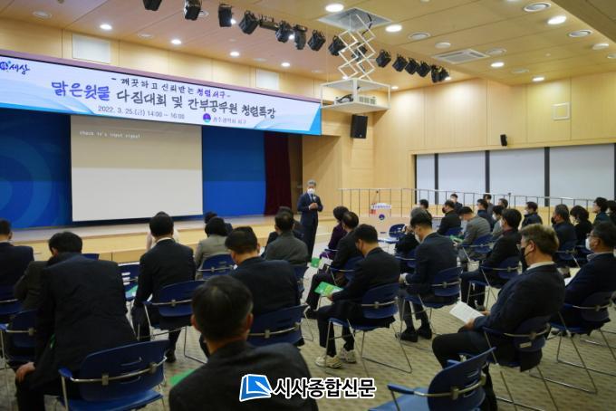 À̹ø, ¡®¸¼Àº À¹° ´ÙÁü´ëȸ¡¯¿¡ Âü¿©ÇÑ °£ºÎ°ø¹«¿øµéÀº ÈÄ¹è °øÁ÷ÀÚ¿¡°Ô ¸ð¹üÀÌ µÇ°í ¼Ö¼±¼ö¹üÇÏ´Â ÀÚ¼¼¸¦ Àϱú¿ö, °øÁ÷»çȸÀÇ ºÒÇÕ¸®ÇÑ °üÇàÀ» ŸÆÄÇÏ°í ±¸¹Î¿¡°Ô ½Å·Ú¹Þ´Â °øÁ÷¹®È¸¦ Á¶¼ºÇϴµ¥ ¾ÕÀå¼³ °ÍÀ» ´ÙÁüÇß´Ù.
