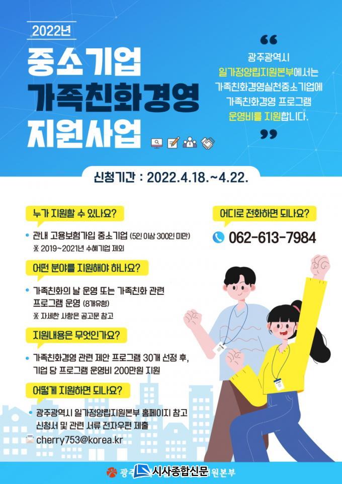 ÇÑÆí, ±¤Áֽà Àϰ¡Á¤¾ç¸³Áö¿øº»ºÎ´Â Áß¼Ò±â¾÷ ¹× »ç¾÷ÀåÀÇ °¡Á·Ä£È°æ¿µÀ» È®»êÇϱâ À§ÇØ Àü±¹ ÃÖÃÊ·Î ÃʵîÀÔÇбâ 10½Ã Ãâ±ÙÁ¦ µµÀÔ Áß¼Ò»ç¾÷Àå Àå·Á±ÝÀ» Áö¿øÇÏ´Â µî °¡Á·Ä£È°æ¿µÀ» ÅëÇØ Àϰú °¡Á¤À» ¾ç¸³ÇÒ ¼ö ÀÖ´Â ´Ù¾çÇÑ Áö¿ø »ç¾÷À» ÃßÁøÇϰí ÀÖ´Ù.