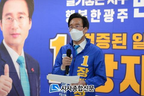 ¡®»ì±âÁÁÀº ¼±¸, ÇູÇÑ ±¤ÁÖ ¸¸µé±â! °ËÁõµÈ ÀϲÛ! ÀåÀ缺¡¯À̶ó´Â ½½·Î°ÇÀ¸·Î ÇÑ ÀåÀ缺 ¿¹ºñÈ帴 ¡°¿ÀÁ÷ ¹ÎÁÖ´ç°ú ÇÔ²²ÇÑ 16³â, ¿ì¸® Áö¿ªÀÌ, ¿ì¸® ¼±¸°¡, ¿ì¸® ±¤ÁÖ°¡ ¼·Î¸¦ À§ÇÏ¸ç ³ª´©°í ºÀ»çÇÏ´Â »çȸ¸¦ ³ª´©°íÀÚ ³ë·ÂÇß´Ù¡±¸ç, ¡°³ª´®°ú ¿¬´ë¸¦ ½ÇõÇϸç, Áö¿ªÀÇ °øµ¿Ã¼ º¹¿ø°ú Ȱ¼ºÈ¸¦ À§ÇØ ÃÖ¼±À» ´ÙÇß´Ù¡±°í ¸»Çß´Ù.