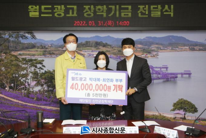 [½Ã»çÁ¾ÇսŹ® = ¿À½ÂÅà ±âÀÚ] ¿ùµå±¤°í ¹Ú´ëº¹‧ÃÖ¿¬È ºÎºÎ´Â 3¿ù 31ÀÏ ½Å¾È±ºÃ»À» ¹æ¹®ÇØ ¾î·Á¿î ȯ°æ¿¡¼ Çо÷¿¡ Á¤ÁøÇÏ´Â ÇлýµéÀ» À§ÇØ »ç¿ëÇØ ´Þ¶ó¸ç ½Å¾È±ºÀåÇÐÀç´Ü¿¡ 4õ¸¸¿øÀÇ ÀåÇбâ±ÝÀ» ¾àÁ¤Çß´Ù.