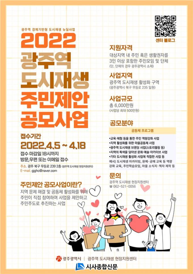 ¡®±¤ÁÖ¿ª µµ½ÃÀç»ý ÁÖ¹ÎÁ¦¾È °ø¸ð»ç¾÷¡¯Àº ÁÖ¹ÎÀÌ Á÷Á¢ Á¦¾ÈÇÏ°í ½ÇÇàÇÏ´Â »ç¾÷À¸·Î ¿ÃÇØ »ç¾÷ºñ´Â 6000¸¸¿øÀ̸ç, »ç¾÷´ç ÃÖ´ë 500¸¸¿øÀ» Áö¿øÇÑ´Ù. ½Åû ÀÚ°ÝÀº ±¤ÁÖ¿ª »ç¾÷±Ç¿ª ³» 3ÀÎ ÀÌ»ó ÁֹΡ¤»ýȰ±ÇÀÚ(¸ðÀÓ) ¶Ç´Â ´ÜüÀÌ¸ç ½Åû±â°£Àº 5ÀϺÎÅÍ 18ÀϱîÁö´Ù.