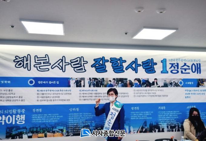 Á¤¼ø¾Ö ¿¹ºñÈ帴 ¡®Çغ»»ç¶÷! ÀßÇÒ»ç¶÷! ±â´ëµÈ´Ù Á¤¼ø¾Ö!¡¯¶ó´Â ½½·Î°ÇÀ¸·Î 8³âÀÇ ÀÇÁ¤È°µ¿(¼±¸ÀÇ¿ø 4³â, ½ÃÀÇ¿ø 4³â)À» ÅëÇØ ÃàÀûµÈ °æÇè°ú ³ëÇϿ츦 ¹ÙÅÁÀ¸·Î ¡°»õ·Î¿î Áö¹æºÐ±Ç ½Ã´ë¸¦ ¸ÂÀÌÇÏ¿© Áö¹æÀÇȸ°¡ µ¶¸³µÇ¾î ±ÇÇѰú Ã¥ÀÓÀÌ °ÈµÇ¾ú´Ù. ±¤ÁÖ½ÃÀÇȸ Á¦8´ë ÈĹݱ⠺ÎÀÇÀåÀ¸·Î¼ Ȱ¾àÇÑ Á¦°¡ ½ÃÀÇ¿ø Àç¼±¿¡ ´ç¼±µÇ¾î, ´ëÀüȯÀÇ ½Ã±â¿¡ ³õÀÎ ±¤ÁÖ½ÃÀÇȸ¿Í Áö¹æºÐ±Ç ½Ã´ëÀÇ µçµçÇÑ ¹öÆÀ¸ñÀ¸·Î¼ ½Ã¹Îµé¿¡°Ô ¾ÈÁ¤°¨À» µå¸®´Â ÀϲÛÀÌ µÇ°Ú´Ù.¡±°í ¾à¼ÓÇß´Ù.