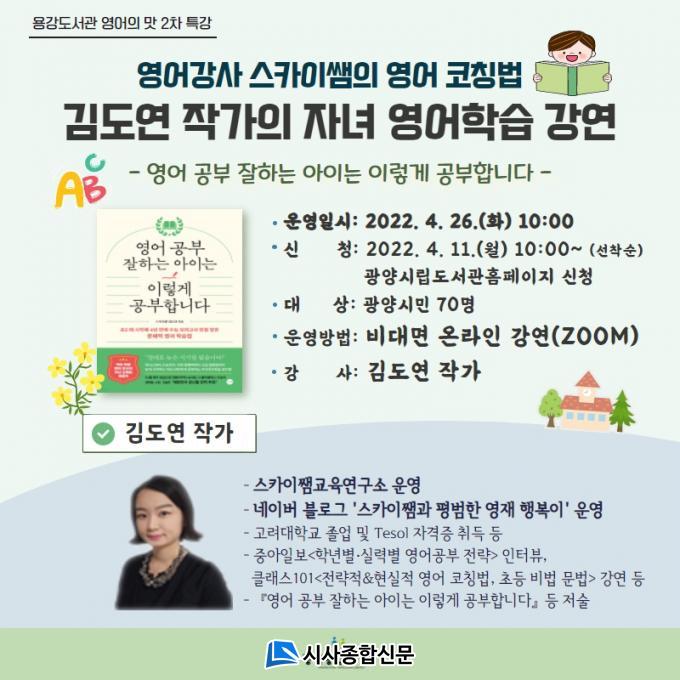 2Â÷ °¿¬Àº 4¿ù 26ÀÏ ¿ÀÀü 10½Ã¿¡ ¿µ¾î±³À° Àü¹®°¡ ¡®½ºÄ«À̽ܡ¯À¸·Î ¾Ë·ÁÁø ±èµµ¿¬ ÀÛ°¡°¡ ¡®¿µ¾î °øºÎ ÀßÇÏ´Â ¾ÆÀÌ´Â ÀÌ·¸°Ô °øºÎÇÕ´Ï´Ù¡¯´Â ÁÖÁ¦·Î ÀÚ³à ¿µ¾î ÇнÀ¹æ¹ý°ú ´Ü°èº°¡¤¿µ¿ªº° ¿µ¾î ÄÚιæ¹ý¿¡ ´ëÇØ Àü´ÞÇÒ ¿¹Á¤ÀÌ´Ù.