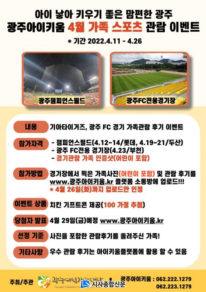 Âü¿© ¹æ¹ýÀº ±â¾ÆÅ¸À̰ÅÁî¿Í ±¤ÁÖFC °æ±â¸¦ °ü¶÷ÇÑ ¾î¸°ÀÌ µ¿¹Ý 3ÀÎ ÀÌ»óÀÇ °¡Á·»çÁø°ú ÇÔ²² °ü¶÷ Èı⸦ ±¤ÁÖ¾ÆÀÌŰ¿ò ȨÆäÀÌÁöÀÇ ¡®°¡Á· ½ºÆ÷Ã÷ °ü¶÷ À̺¥Æ®¡¯¶õ¿¡ °Ô½ÃÇÏ¸é µÈ´Ù. Ãß÷À» ÅëÇØ 100 °¡Á·¿¡°Ô ġŲ ±³È¯±ÇÀ» Áö±ÞÇϸç, ´ç÷ÀÚ´Â 29ÀÏ ±¤ÁÖ¾ÆÀÌŰ¿ò ȨÆäÀÌÁö¿¡ ¹ßÇ¥ÇÑ´Ù.