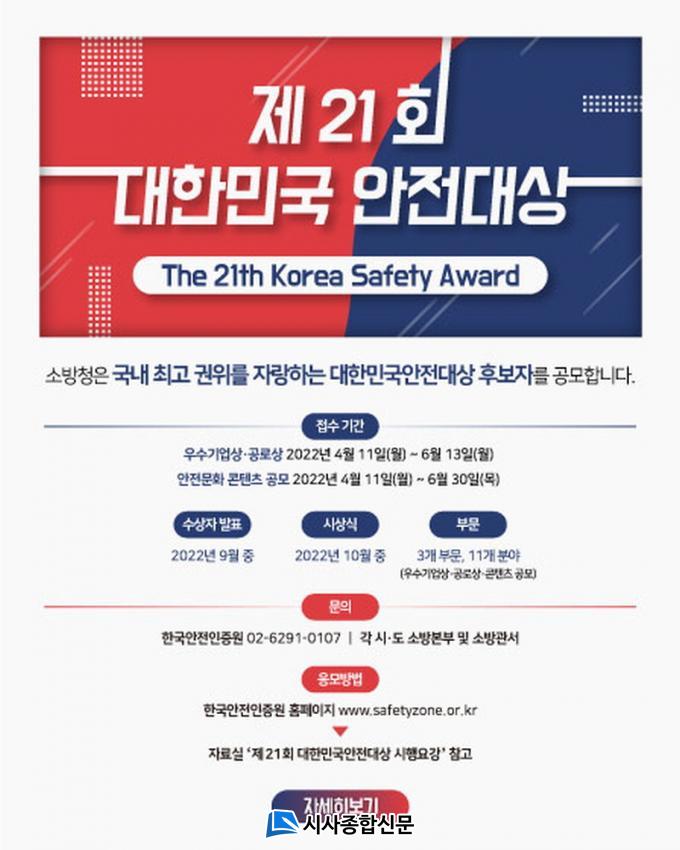 ¼Ò¹æÃ»ÀÌ ÁÖÃÖÇϰí Çѱ¹¾ÈÀüÀÎÁõ¿ø°ú Çѱ¹¼Ò¹æ»ê¾÷±â¼ú¿ø, Çѱ¹¼Ò¹æ¾ÈÀü¿øÀÌ ÁÖ°üÇÏ´Â Á¦21ȸ ´ëÇѹα¹ ¾ÈÀü´ë»óÀº ¼Ò¹æ´ë»ó¹°ÀÇ ÀÚÀ² ¾ÈÀü°ü¸®¸¦ À¯µµÇÏ°í ¾ÈÀüÇÑ ±â¾÷°æ¿µ ¹®È¸¦ È®´ëÇϱâ À§ÇØ ¿î¿µµÈ´Ù. °ø¸ð ºÐ¾ß´Â ¡ã¿ì¼ö ±â¾÷»ó 6°³(¼ºñ½º, °ø°ø¼ºñ½º, ¿¡³ÊÁö, °Ç¼³, Á¦Á¶, ¿î¼ö¡¤Ã¢°í¡¤Åë½Å) ¡ã°ø·Î»ó 3°³(¿ì¼öÁ¦Ç°, ´Üü¡¤°³ÀÎ, ¼Ò¹æ°ø¹«¿ø ǥâ) ¡ã¾ÈÀü¹®È ÄÜÅÙÃ÷ °ø¸ð»ó 2°³(UCC, À¥Å÷) µîÀ¸·Î ³ª´¶´Ù.