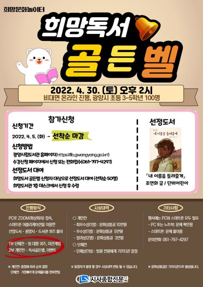Âü¿©ÀÚµéÀ» °Ý·ÁÇϱâ À§ÇØ °³ÀÎÀü ¼ºÀû¿¡ µû¶ó ÃÖ¿ì¼ö 1¸í(10¸¸ ¿ø), ¿ì¼ö 1¸í(5¸¸ ¿ø), Àå·Á 2¸í(3¸¸ ¿ø)À» »Ì¾Æ ¹®È»óǰ±ÇÀ» ÁõÁ¤Çϰí, ´ÜüÀü ¿ì½ÂÆÀ 1ÆÀ¿¡°Ô´Â ±âÇÁƼÄÜ »óǰÀÌ Á¦°øµÉ ¿¹Á¤ÀÌ´Ù. ´ëȸ Âü¿©¸¦ Èñ¸ÁÇÏ´Â ¾î¸°ÀÌ´Â Èñ¸Áµµ¼°üÀ¸·Î ÀüÈ(¢Ï061-797-4297)Çϰųª ȨÆäÀÌÁö(lib.gwangyang.go.kr)¿¡¼ ½ÅûÇÏ¸é µÈ´Ù.