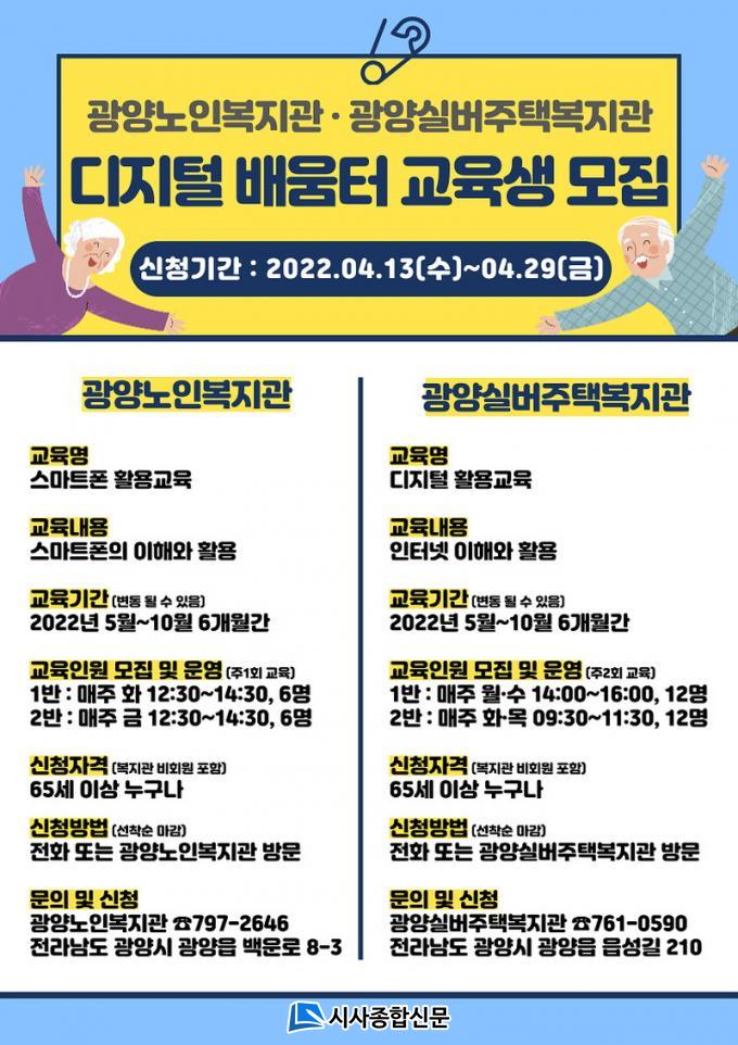 ±³À°À» Èñ¸ÁÇÏ´Â ¾î¸£½ÅÀº 4¿ù 29ÀϱîÁö ÀüÈ(±¤¾ç³ëÀκ¹Áö°ü ¢Ï061-797-2646, ±¤¾ç½Ç¹öÁÖÅú¹Áö°ü ¢Ï061-761-0590) ¶Ç´Â ¹æ¹®ÇØ ½ÅûÇÏ¸é µÇ°í, º¹Áö°ü ȸ¿øÀÌ ¾Æ´Ï´õ¶óµµ 65¼¼ ÀÌ»óÀÌ¸é ´©±¸³ª ½ÅûÇÒ ¼ö ÀÖ´Ù.