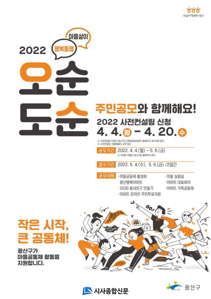 ÇÑÆí, ¡®2022³â ¿À¼øµµ¼ø ¸¶À»»ìÀÌ Çູµ¿Ç࡯ Áֹΰø¸ð °èȹ¼´Â 5¿ù4~6ÀÏ Á¢¼öÇϸç, ½ÅûÀ» Èñ¸ÁÇÏ´Â ÁֹΠ¸ðÀÓ, °øµ¿Ã¼ µîÀº ¸¶À»¹è¿òÅÍ ±³À°À» À̼öÇÑ µÚ »çÀüÄÁ¼³ÆÃÀ» °ÅÃÄ¾ß ÇÑ´Ù. ¸¶À»¹è¿òÅÍ ±³À°Àº ±¤»ê±¸, ±¤»ê±¸ µµ½ÃÀç»ý°øµ¿Ã¼¼¾ÅÍ À¯Æ©ºê ä³Î¿¡¼ ¼ö°ÇÒ ¼ö ÀÖ´Ù.
