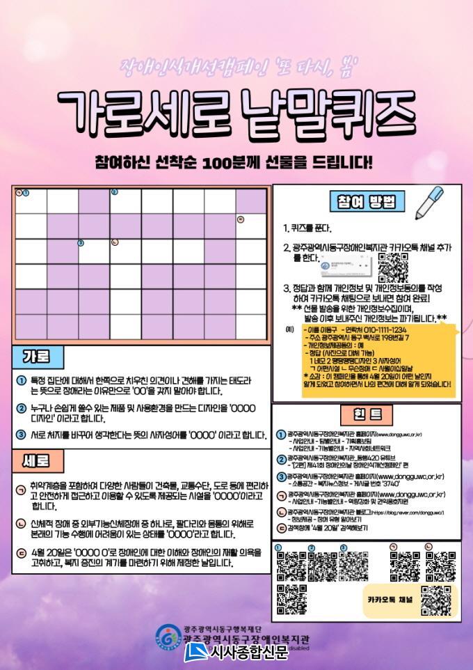 ºñ´ë¸é Àå¾ÖÀνݳ¼±Ä·ÆäÀÎÀ¸·Î Àå¾Ö¿¡ ´ëÇÑ ÀÌÇØ¸¦ ³ôÀÌ´Â °¡·Î¼¼·Î ³¹¸»ÄûÁ ÁøÇàÇÑ´Ù. ȨÆäÀÌÁö ¹× °ø½Ä SNSä³Î(ÆäÀ̽ººÏ, ³×À̹ö ºí·Î±×, īī¿ÀÅåä³Î)¿¡ ÄûÁî°¡ ¾È³»µÇ¾î ÀÖÀ¸¸ç, ¼±Âø¼ø 100¸í¿¡°Ô´Â Åùè·Î ¼±¹°À» µå¸°´Ù°í ¹àÇû´Ù. Âü¿©´Â ¡®±¤ÁÖ±¤¿ª½Ãµ¿±¸Àå¾ÖÀκ¹Áö°ü¡¯ īī¿ÀÅåä³Î·Î äÆÃÀ» ÅëÇØ Âü¿©ÇÒ ¼ö ÀÖ´Ù.