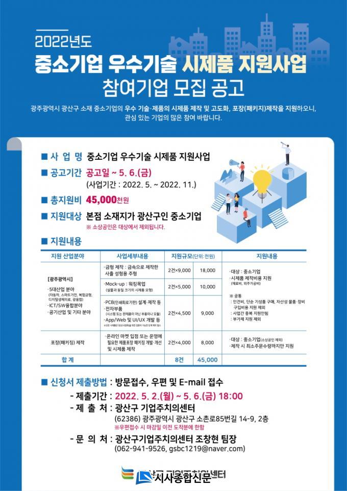 | ±¤Áֽà ±¤»ê±¸, Áß¼Ò±â¾÷ ¿ì¼ö±â¼ú ½ÃÁ¦Ç° Á¦ÀÛ Áö¿ø 5¿ù6ÀϱîÁö Âü¿© ±â¾÷ ¸ðÁý¡¦¾÷ü´ç ÃÖ´ë 900¸¸ ¿ø |