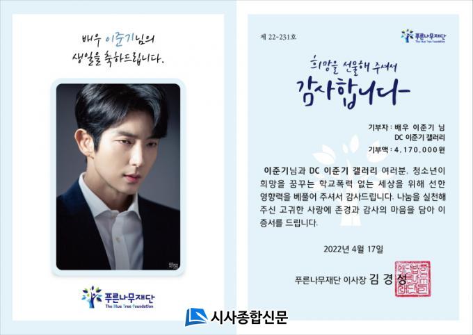 [½Ã»çÁ¾ÇսŹ® = ¿À½ÂÅà ±âÀÚ] ¹è¿ì ÀÌÁØ±â ÆÒŬ·´ÀÎ ¡®DC ÀÌÁر⠰¶·¯¸®¡¯´Â Áö³ 4¿ù 17ÀÏ ÀÌÁرâÀÇ »ýÀÏÀ» ±â³äÇØ Çб³Æø·Â ÇÇÇØ û¼Ò³âÀ» À§ÇØ Çª¸¥³ª¹«Àç´Ü¿¡ ±âºÎ±ÝÀ» Àü´ÞÇß´Ù.