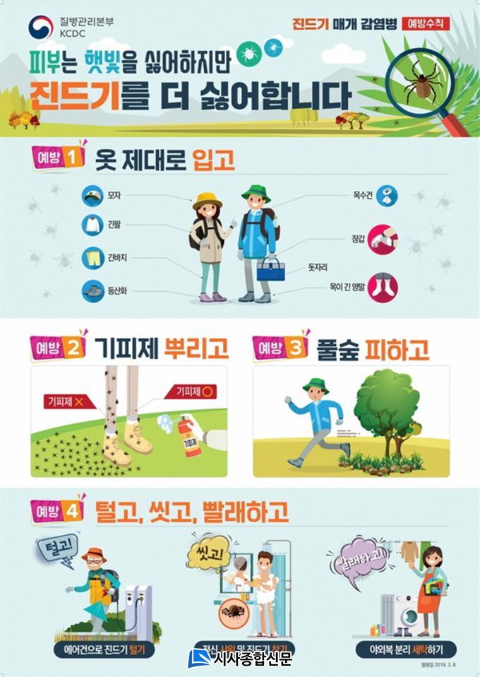 Á¦3±Þ°¨¿°º´ÀÎ ÁßÁõ¿¼ºÇ÷¼ÒÆÇ°¨¼ÒÁõÈıº(SFTS)Àº ¾ß¿Ü Ȱµ¿ ½Ã Áøµå±â¿¡ ¹°¸®Áö ¾Êµµ·Ï ¿¹¹æÇÏ´Â °ÍÀÌ ÃÖ¼±ÀÇ ¹æ¹ýÀÌ¸ç ±ä ¼Ò¸Å, ±ä ¹ÙÁö, ¸ðÀÚ µîÀ¸·Î ¾ÈÀüÇÏ°Ô ¿ÊÀ» °®Ãç ÀÔ¾î¾ß ÇÏ°í ¾ß¿ÜȰµ¿ ÈÄ 2ÁÖ À̳» 38¡ÉÀÌ»óÀÇ °í¿°ú ¿À½É, ±¸Åä, ¼³»ç µî ¼ÒȱâÁõ»óÀÌ ¹ß»ýÇÒ °æ¿ì Áï°¢ ÀÇ·á±â°üÀ» ¹æ¹®ÇÏ´Â °ÍÀÌ Áß¿äÇÏ´Ù.