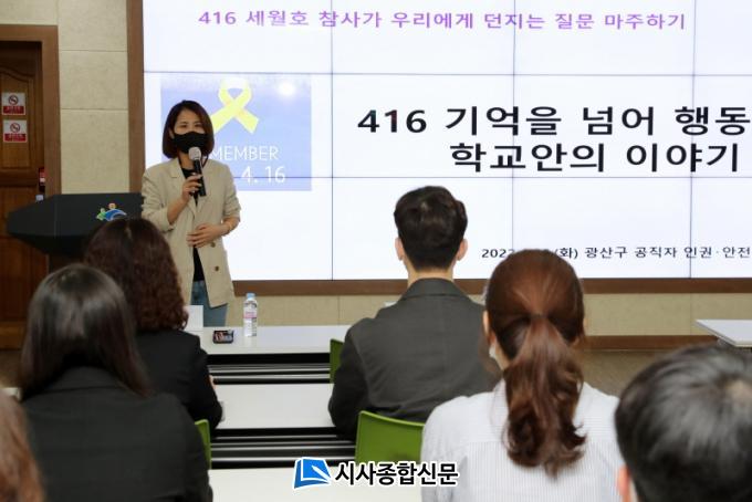 ±¤»ê±¸´Â Áö³ 26ÀÏ ±¸Ã» 2Ãþ »óȲ½Ç¿¡¼ ¡®4.16 ±â¾ïÀ» ³Ñ¾î ÇൿÇÏ´Â Çб³ ¾ÈÀÇ À̾߱⡯¸¦ ÁÖÁ¦·Î °øÁ÷ÀÚ ÀαÇ‧¾ÈÀü ±³À°À» ÁøÇàÇß´Ù. ¼¼¿ùÈ£ Âü»ç 8ÁÖ±â, ±â¾ï°ú ¾à¼ÓÀÇ ´ÞÀ» ¸Â¾Æ ¸¶·ÃÇÑ ±³À°À¸·Î, ½ÇÁ¦ ±³À° ÇöÀå¿¡¼ ¡®¼¼¿ùÈ£ ±³ÈÆ¡¯À» ¾Ë¸®´Â Åä·Ð‧üÇèÇü ¼ö¾÷À» ÁøÇàÇϰí ÀÖ´Â À̰ÇÁø ±³»ç°¡ °»ç·Î ³ª¼¹´Ù.