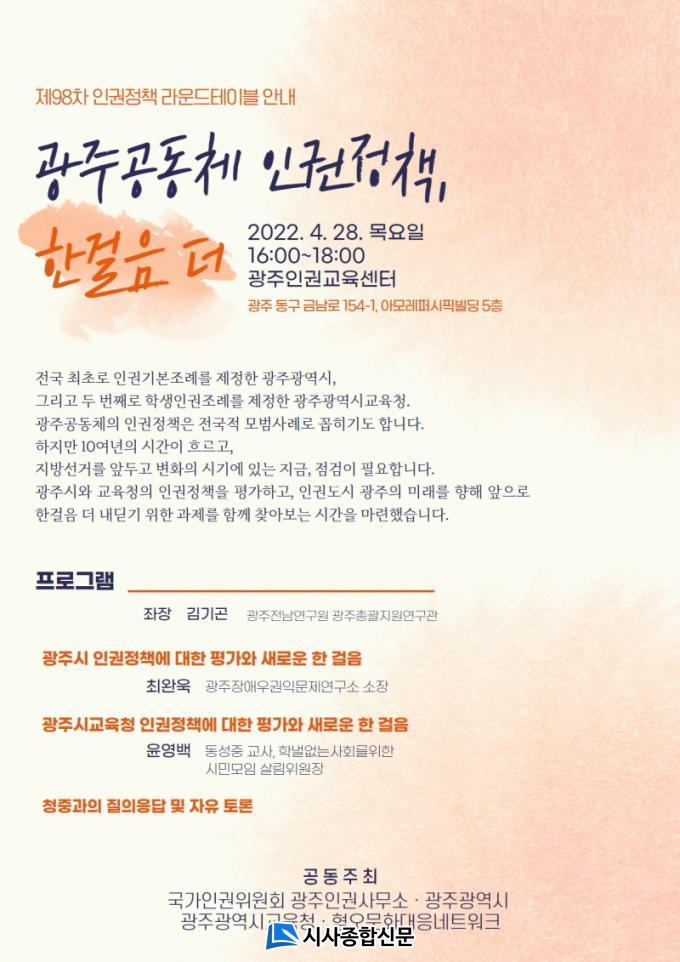 À̹ø ¶ó¿îµåÅ×À̺íÀº ±¹°¡ÀαÇÀ§¿øÈ¸ ±¤ÁÖÀαDZ³À°¼¾ÅÍ¿¡¼ Áý´ãȸ Çü½ÄÀ¸·Î °³ÃÖÇÑ´Ù. ±¤ÁÖ½Ã¿Í ½Ã±³À°Ã»ÀÇ ÀαÇÁ¤Ã¥À» °¢°¢ Æò°¡ÇÏ´Â ¹ßÁ¦¸¦ ÇÑ ÈÄ Âü°¡ÀÚµé °£ ÀÚÀ¯Åä·ÐÀ¸·Î ÁøÇàµÉ ¿¹Á¤ÀÌ´Ù.