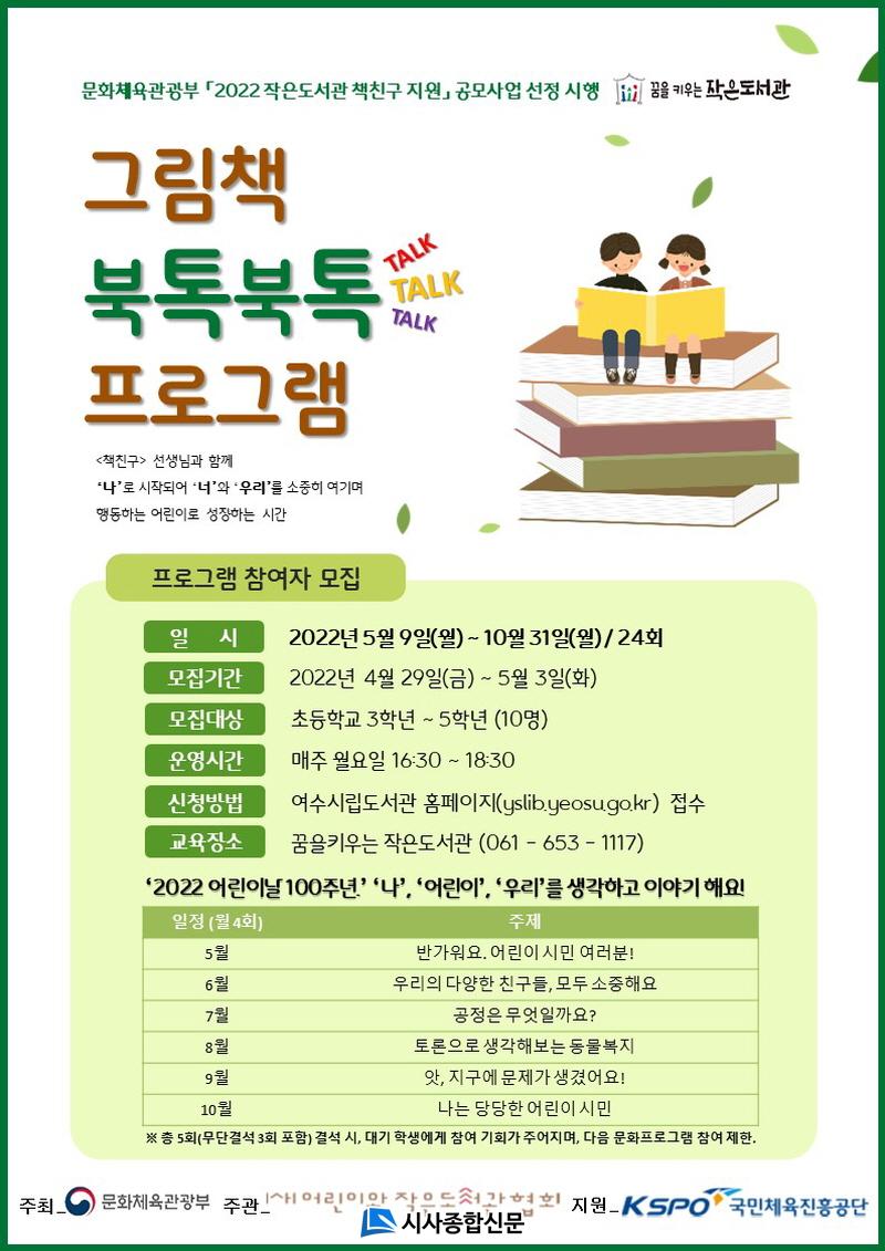 ¾î¸°À̳¯ 100ÁÖ³âÀ» ¸ÂÀÌÇØ ¡®ÀÛÀºµµ¼°ü, ¾î¸°ÀÌ ½Ã¹ÎÀ» ¸¸³ª´Ù¡¯´Â ÁÖÁ¦·Î å챏¿Í ÇÔ²² ±×¸²Ã¥À¸·Î À̾߱âÇÏ´Â ½Ã°£À» °®°Ô µÈ´Ù.ÀÌ¿¡ µû¶ó ¿À´Â 5¿ùºÎÅÍ 10¿ù±îÁö ÃʵîÇб³ 3Çгâ~5Çгâ(10¸í)À» ´ë»óÀ¸·Î ¡®±×¸²Ã¥ ºÏÅåºÏÅå(Talk)¡¯ ÇÁ·Î±×·¥À» ÁøÇàÇÑ´Ù.