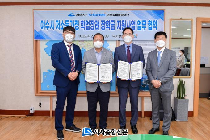 [½Ã»çÁ¾ÇսŹ® = ¿À½ÂÅà ±âÀÚ] ¿©¼ö½Ã¿Í ±Í¶Ñ¶ó¹Ì±×·ì(ȸÀå ÃÖÁø¹Î)ÀÌ 27ÀÏ ºÎ½ÃÀå½Ç¿¡¼ ¡®¿©¼ö½Ã Àú¼Òµæ°¡Á¤ Çо÷Àå·Á ÀåÇÐ±Ý Áö¿ø »ç¾÷¡¯ ÃßÁøÀ» À§ÇÑ ¾÷¹«Çù¾àÀ» ü°áÇß´Ù. À̳¯ Çù¾à½Ä¿¡´Â ¹ÚÇö½Ä ºÎ½ÃÀå°ú ±èº´°ü ±Í¶Ñ¶ó¹Ì À¯ÅëºÎ¹®Àå(ÀÌ»ç)ÀÌ Âü¼®ÇØ ÀåÇÐ±Ý 3õ¸¸ ¿øÀ» Áö¿øÇϱâ·Î ¾à¼ÓÇß´Ù.