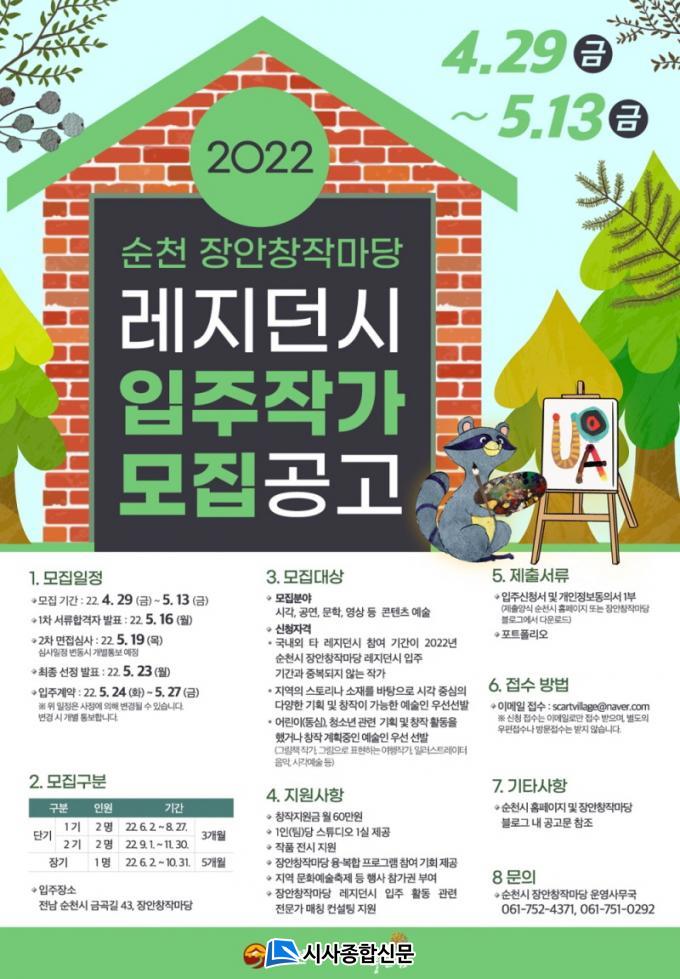 ¼øÃµ Àå¾ÈâÀÛ¸¶´ç ·¹Áö´ø½Ã »ç¾÷Àº ¿¹¼ú°¡¿¡°Ô ÀÏÁ¤ÇÑ ÀÛ¾÷°ø°£ Á¦°ø°ú Ä¿¹Â´ÏƼ ÇÁ·Î±×·¥ ¹× Àü½Ã Áö¿øÀ» ÅëÇØ ÀÛ°¡ÀÇ Ã¢ÀÛȰµ¿À» Ȱ¼ºÈÇϰí, Áö¿ª »çȸ¿Í ÇÔ²²ÇÏ´Â ´Ù¾çÇÑ ÇÁ·Î±×·¥À¸·Î Áö¿ª ¿¹¼ú ½ÃÀå¿¡ Ȱ·ÂÀ» ÁÖ´Â °ÍÀÌ ¸ñÀûÀÌ´Ù. ½Ã´Â ½Ã°¢¡¤°ø¿¬¡¤¹®ÇС¤¿µ»ó µî ÄÜÅÙÃ÷ ¿¹¼ú Áß½ÉÀ¸·Î, ÃÑ 5¸íÀ» 2022³â Àå¾ÈâÀÛ¸¶´ç ·¹Áö´ø½Ã ÀÔÁÖÀÛ°¡·Î ¼±¹ßÇÒ °èȹÀÌ´Ù.