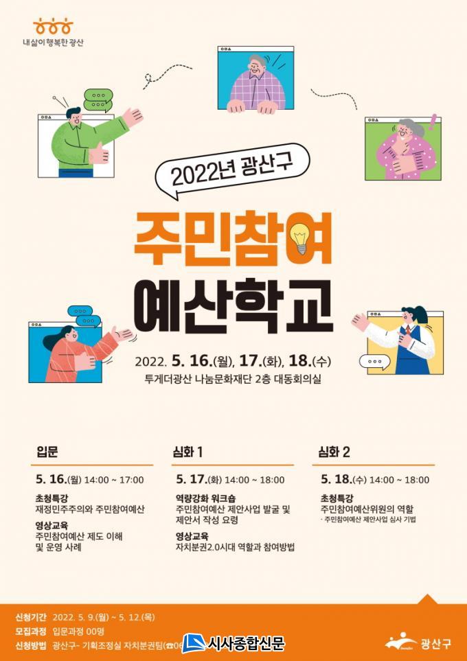 16ÀϺÎÅÍ 18ÀϱîÁö Åõ°Ô´õ±¤»ê ³ª´®¹®ÈÀç´Ü 2Ãþ ´ëµ¿È¸Àǽǿ¡¼ ¿¸®´Â ¡®2022 ±¤»ê±¸ ÁÖ¹ÎÂü¿©¿¹»êÇб³¡¯´Â ÀÏ¹Ý ÁÖ¹ÎÀ» ´ë»óÀ¸·Î ÇÏ´Â ÀÔ¹® °úÁ¤°ú ±¤»ê±¸ ÁÖ¹ÎÂü¿©¿¹»êÀ§¿øÀÇ ¿ª·®°È¸¦ À§ÇÑ ½ÉÈ °úÁ¤À¸·Î ³ª´¶´Ù. À̹ø ¿¹»êÇб³´Â Áö¹æÀÚÄ¡¹ý ÀüºÎ°³Á¤¿¡ µû¸¥ ÀÚÄ¡ºÐ±Ç2.0 ½Ã´ëÀÇ ÁÖüÀÎ ÁÖ¹ÎÀÇ ¿ªÇÒ°ú Âü¿© ¹æ¹ýÀ» ÁßÁ¡ÀûÀ¸·Î ´Ù·ç¸ç ÁÖ¹ÎÂü¿©¿¹»êÀ§¿øÀÇ ¿ªÇÒÀ» ÀçÁ¶¸íÇÒ ¿¹Á¤ÀÌ´Ù.
