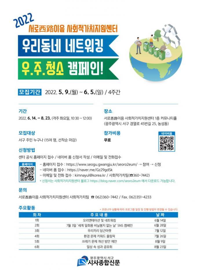 ½Åû¸¶°¨ ´ÙÀ½ ÁÖÀÎ 6¿ù 14ÀϺÎÅÍ 8¿ù 23ÀϱîÁö ¸Å °ÝÁÖ È¿äÀϸ¶´Ù ¡®¿ìÁÖû¼Ò(¿ì¸®.ÁÖº¯.û¼Ò) Ä·ÆäÀΡ¯À» ÁÖÁ¦·Î ¡ã ³»°¡ »ç´Â ¿ì¸®µ¿³× Ű¿öµå ¼Ò°³Çϱ⠡ã 7¿ù 3ÀÏ ¡®¼¼°è ÀÏȸ¿ë ºñ´ÒºÀÁö ¾ø´Â ³¯¡¯ SNS Ä·ÆäÀÎ, ¡ã ¿ì¸®³¢¸® ´ç±Ù¸¶ÄÏ ¡ã ȯ°æ ¹®Á¦ Ű¿öµå ¿Ã¸²ÇÈ ¡ã ¾²·¹±â ¹®Á¦ °³¼± ¹æ¾È Á¦¾È ¡ã ÀÏ»ó ¼Ó ¼º°ú °øÀ¯È¸ µî ÃÑ 6ȸ·Î ±¸¼º¡¤¿î¿µÇÒ °èȹÀÌ´Ù.