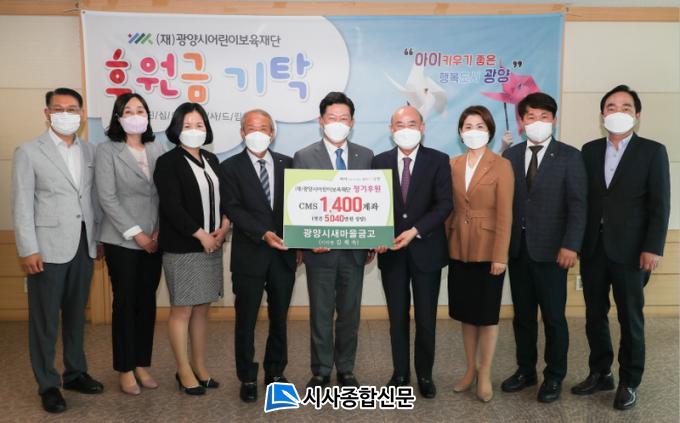 À̳¯ ±âŹ½Ä¿¡´Â ±¤¾ç½Ã »õ¸¶À»±Ý°í(ÀÌ»çÀå ±èÀç¼÷)¿¡¼ ¿µ‧À¯¾Æ±â ¾î¸°À̸¦ À§ÇÑ º¸À°»ç¾÷¿¡ »ç¿ëÅä·Ï Á¤±âÈÄ¿ø CMS 1,400°èÁÂ(¿¬°£ 5,040¸¸¿ø »ó´ç)¸¦ Àü´ÞÇß´Ù.