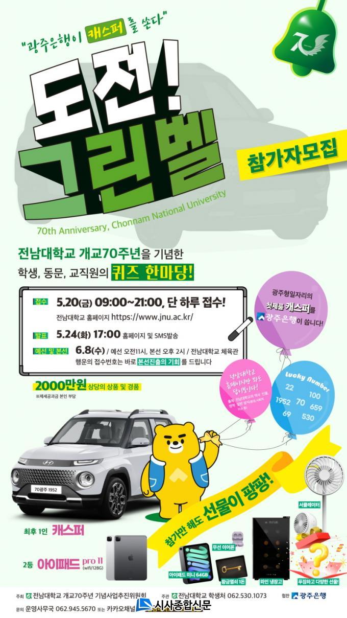 Àü³²´ë´Â 6¿ù 8ÀÏ Àü³²´ë üÀ°°ü¿¡¼ ±¤ÁÖÀºÇàÀÌ ÇùÂùÇÑ °æÀÚµ¿Â÷ ¡®±â¾Æ ij½ºÆÛ¡¯¸¦ ¿ì½Â»óǰÀ¸·Î ³»°É°í, Âü°¡ÀÚµéÀ» À§ÇÑ »óǰÀ» ´ë°Å °æÇ°À¸·Î ³»°Ç ÄûÁî ÇѸ¶´ç ¡®µµÀü! ±×¸°º§¡¯À» ÆîÄ£´Ù.