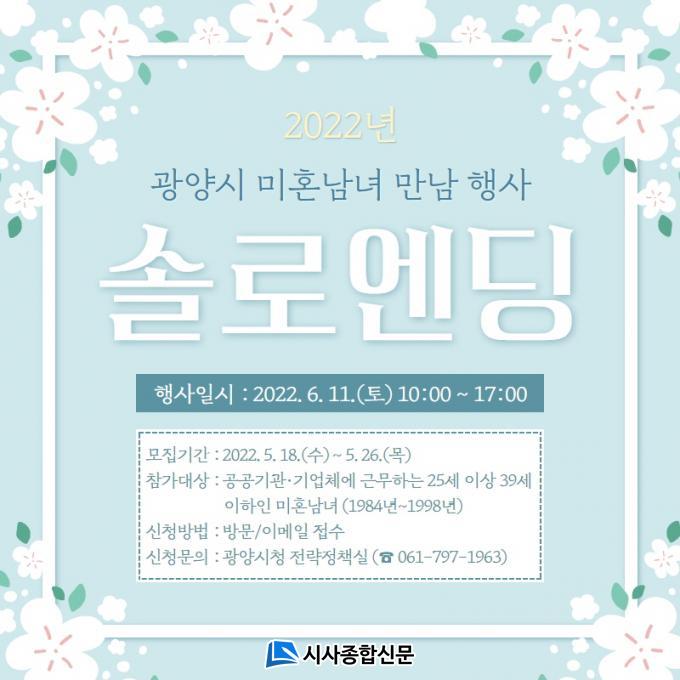 ¡®±¤¾ç ¼Ö·Î¿£µù¡¯Àº ¹Ù»Û ÀÏ»ó°ú Äڷγª19 Àå±âÈ µîÀ¸·Î À̼ºÀ» ¸¸³¯ ±âȸ¸¦ ¸¸µéÁö ¸øÇÑ ¹ÌÈ¥ ³²³à¿¡°Ô °ÇÀüÇÑ ¸¸³²ÀÇ ±âȸ¸¦ Á¦°øÇϰí, °áÈ¥ Ä£ÈÀûÀÎ ºÐÀ§±â Á¶¼ºÀ» À§ÇØ ¸¶·ÃÇÏ´Â Çà»çÀÌ´Ù. Áö³ 2³â°£ Äڷγª19 »çȸÀû °Å¸®µÎ±â Áö¼Ó¿¡ µû¶ó ¿Â¶óÀÎÀ» ÀÌ¿ëÇØ ºñ´ë¸é ¹æ½ÄÀ¸·Î ÁøÇàÇßÀ¸³ª, ¿ÃÇØ Çà»ç´Â »çȸ Àü¹ÝÀûÀÎ ¹æ¿ª ¿ÏÈ¿¡ ¹ß¸ÂÃç ûÃá³²³àÀÇ Àû±ØÀûÀÎ ¸¸³²À» Àå·ÁÇϱâ À§ÇØ ´ë¸éÀ¸·Î ÁøÇàÇÒ ¿¹Á¤ÀÌ´Ù.