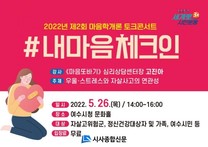 | ¿©¼ö½Ã´Â º½Ã¶ ÀÚ»ì°íÀ§Çè ½Ã±â¸¦ ¸Â¾Æ ¿À´Â 26ÀÏ ¿ÀÈÄ 2½Ã ¿©¼ö½Ãû ¹®ÈȦ¿¡¼ ¡®¸¶À½Çа³·Ð ÅäÅ©ÄܼƮ¡¯¸¦ °³ÃÖÇÑ´Ù.