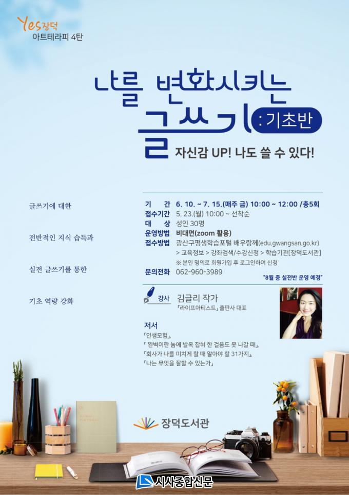 6¿ù10ÀϺÎÅÍ 7¿ù15ÀϱîÁö ±Û¾²±â ÀÔ¹® °úÁ¤ÀÎ ±âº»¹Ý ¡®Àڽۨ up! ³ªµµ ¾µ ¼ö ÀÖ´Ù¡¯°¡, À̾î 8¿ù26ÀϺÎÅÍ 9¿ù30ÀϱîÁö ½ÇÀü¹Ý ¡®³» ±ÛÀÌ Ã¥ÀÌ µÈ´Ù¡¯°¡ Â÷·Ê·Î ÁøÇàµÈ´Ù. ¼ö°½ÅûÀº ±¤»ê±¸ Æò»ýÇнÀÆ÷ÅÐ(edu.gwangsan.go.kr)¿¡¼ ÇÒ ¼ö ÀÖ´Ù. ±âº»¹ÝÀº 23ÀϺÎÅÍ 6¿ù9ÀϱîÁö, ½ÇÀü¹ÝÀº 8¿ù10ÀϺÎÅÍ ½ÅûÀ» ¹Þ´Â´Ù.