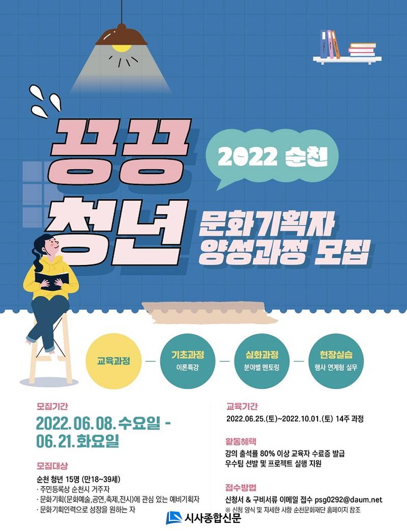 °ÀǺ° ÀÚ¼¼ÇÑ ³»¿ë°ú ÀÏÁ¤Àº ¼øÃµ¹®ÈÀç´Ü ´©¸®Áý¿¡¼ È®ÀÎÇÒ ¼ö ÀÖÀ¸¸ç, Âü¿©¸¦ ¿øÇÏ´Â ¼øÃµ û³âÀº ½Åû¼¿Í ±¸ºñ¼·ù¸¦ °®Ãç psg0292@daum.net À̸ÞÀÏ Á¢¼öÇÏ¸é µÈ´Ù. ±âŸ»çÇ×Àº (Àç)¼øÃµ¹®ÈÀç´Ü ¹®ÈÁ¤Ã¥ÆÀ (¢Ï061-746-2916)°ú ¾ÆÄ«µ¥¹Ì ¿î¿µ»ç¹«±¹(¢Ï061-751-0292)·Î ¹®ÀÇÇÏ¸é µÈ´Ù.