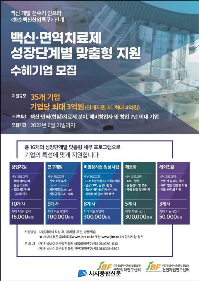 ½ÅûÀº ¿À´Â 21ÀϱîÁöÀ̸ç, Æò°¡À§¿øÈ¸¸¦ °ÅÃÄ ÃÑ 35°³»ç¸¦ ¼±Á¤ÇÏ°í ¿¬¸»±îÁö Áö¿ø»ç¾÷À» ¼öÇàÇÏ°Ô µÈ´Ù. ÀÚ¼¼ÇÑ »çÇ×Àº ȨÆäÀÌÁö www.jbrc.re.kr ¶Ç´Â www.jinr.re.kr¿¡¼ È®ÀÎÀÌ °¡´ÉÇÏ´Ù.