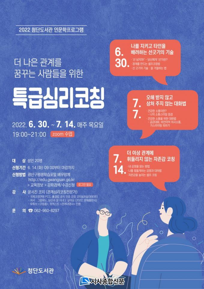 30ÀϺÎÅÍ 7¿ù 14ÀϱîÁö ¸ÅÁÖ ¸ñ¿äÀÏ °ü°è½É¸® ÄÚĪ Àü¹®°¡ À±¼Áø ÀÛ°¡¿Í ÇÔ²² ºñ´ë¸é ¿Â¶óÀÎ È»ó °ÀÇ(ZOOM) ¹æ½ÄÀ¸·Î ÃÑ 3ȸ ¿î¿µÇÑ´Ù.