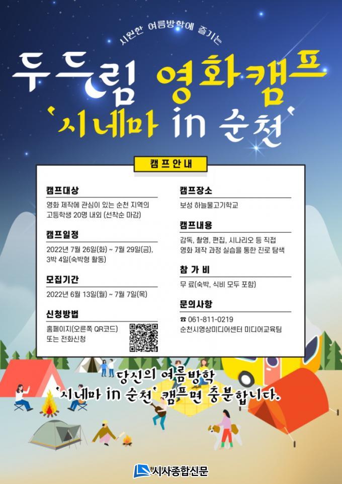 ¡®½Ã³×¸¶ in ¼øÃµ¡¯Àº 7¿ù 26ÀϺÎÅÍ 29ÀϱîÁö 3¹Ú 4Àϰ£ º¸¼º Çϴù°°í±âÇб³¿¡¼ ÁøÇàµÇ´Â ¼÷¹ÚÇü Ä·ÇÁ·Î, û¼Ò³âµéÀÌ Á÷Á¢ ¿µÈ Á¦ÀÛ°úÁ¤À» ½Ç½ÀÇϸç Áø·Î¸¦ Ž»öÇÒ ¼ö ÀÖ´Â ¿µÈÁ¦ÀÛ Ä·ÇÁ´Ù.