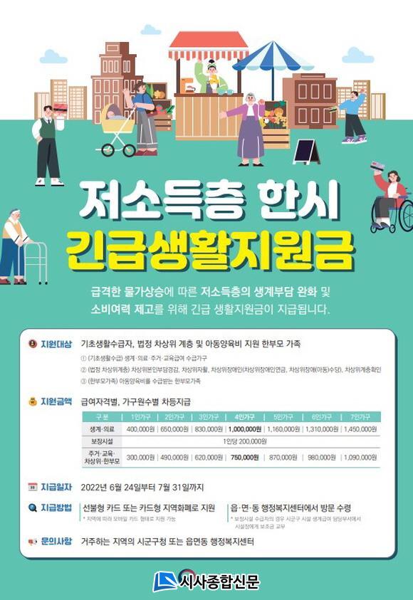 Àú¼ÒµæÃþ Çѽà ±ä±Þ »ýȰÁö¿ø±Ý Áö¿ø ´ë»óÀº 2022³â 5¿ù 29ÀÏ ±âÁØ ±âÃÊ»ýȰ¼ö±ÞÀÚ, ¹ýÁ¤ Â÷»óÀ§ °èÃþ ¹× ¾Æµ¿ ¾çÀ°ºñ Áö¿ø ÇѺθð°¡Á·ÀÌ´Ù. Áö¿ø ±Ý¾×Àº ÁÖ°Å‧±³À°‧Â÷»óÀ§‧ÇѺθð 1ÀÎ °¡±¸´Â 30¸¸ ¿ø, 2ÀÎ °¡±¸´Â 49¸¸ ¿ø µî ±Þ¿© Àڰݺ°, °¡±¸¿ø ¼ö º°·Î Â÷µî Áö±ÞµÈ´Ù.