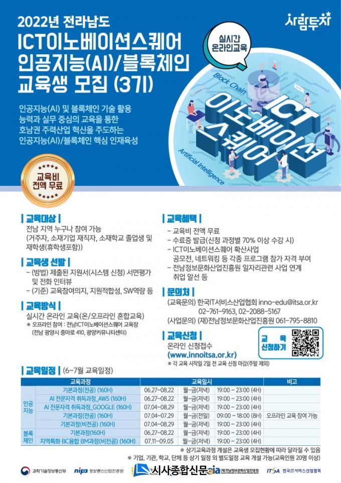 ±³À°ºñ´Â Àü¾× ¹«·áÀ̰í ÀΰøÁö´É(AI)°ú ºí·ÏüÀο¡ °ü½ÉÀÌ ÀÖ°í Àü¹®¼ºÀ» ³ôÀÌ°í ½ÍÀº Àü³²µµ¹ÎÀÌ¸é ´©±¸³ª Àü³²ICTÀ̳뺣À̼ǽºÄù¾î ´©¸®Áý(www.innoitsa.or.kr)À» ÅëÇØ ½ÅûÇÒ ¼ö ÀÖÀ¸¸ç, ¼ö·áÀÚ´Â Ãë¾÷ ¿¬°èµµ Áö¿øÇÑ´Ù.