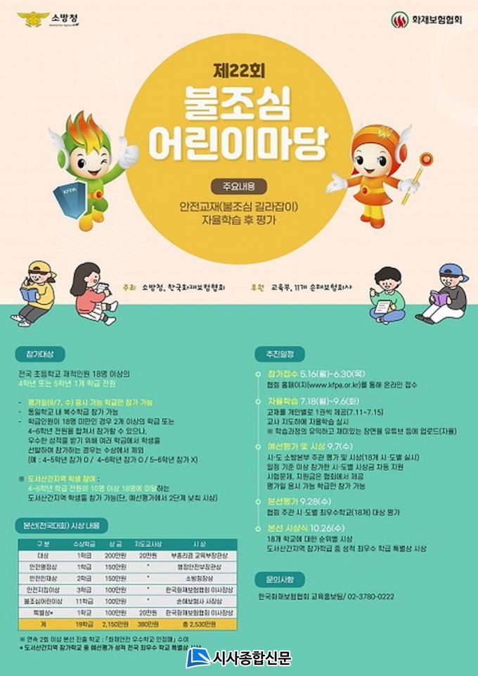 ¼Ò¹æÃ»°ú Çѱ¹ÈÀ纸ÇèÇùȸ°¡ ÁÖÃÖÇÏ°í ±³À°ºÎ¿Í 11°³ ¼ÕÇØº¸Çèȸ»ç°¡ ÈÄ¿øÇÏ´Â À̹ø Çà»ç´Â ÈÀç ¹× »ýȰ¾ÈÀü µîÀÇ ³»¿ëÀÌ Æ÷ÇÔµÈ ±³À縦 ÀÚÀ²ÇнÀ ÈÄ Æò°¡ÇÏ´Â ´ëȸ·Î ¾î¸°ÀÌ¿¡°Ô ¾ÈÀü¿¡ °üÇÑ Áö½ÄÀ» ÀÍÈ÷°Ô ÇϰíÀÚ ¸Å³â °³Ãֵǰí ÀÖ´Ù.