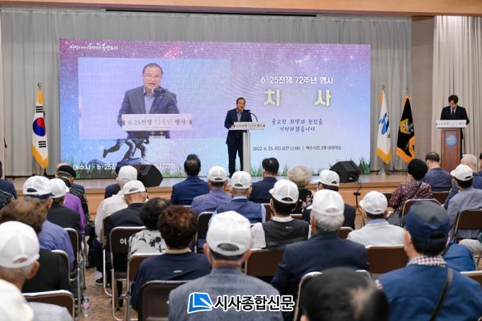 À̳¯ Çà»ç¿¡´Â ¹ÚÇö½Ä ¿©¼ö½ÃºÎ½ÃÀå°ú µµ‧½ÃÀÇ¿ø, º¸ÈÆ‧¾Èº¸´ÜüÀåÀ» ºñ·ÔÇØ ÂüÀüÀ¯°øÀÚ¿Í À¯Á· µî 200¿©¸íÀÌ Âü¼®Çß´Ù. ½ÄÀüÇà»çÀÎ 6.25ÀüÀï ¿µ»ó ½ÃûÀ» ½ÃÀÛÀ¸·Î ±¹¹ÎÀÇ·Ê, ±â³ä»ç¿Í Ä¡»ç, Ãß¸ð°ø¿¬, 6.25³ë·¡ Á¦Ã¢ µîÀÌ À̾îÁ³´Ù.