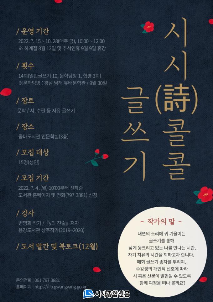 ¡®½Ã½Ã(ãÌ)ÄÝÄÝ ±Û¾²±â¡¯ ÇÁ·Î±×·¥ °ü·Ã ¼¼ºÎÀûÀÎ ³»¿ë°ú ÀÏÁ¤ µîÀº ±¤¾ç½Ã¸³µµ¼°ü ȨÆäÀÌÁö(lib.gwangyang.go.kr)¿Í īī¿ÀÅå ä³Î, ÀνºÅ¸±×·¥ µîÀ» ÅëÇØ È®ÀÎÇÒ ¼ö ÀÖÀ¸¸ç, ÀÚ¼¼ÇÑ ³»¿ëÀº ±¤¾çÁ߸¶µµ¼°ü(¢Ï061-797-3881)À¸·Î ¹®ÀÇÇÏ¸é ¾Ë ¼ö ÀÖ´Ù.
