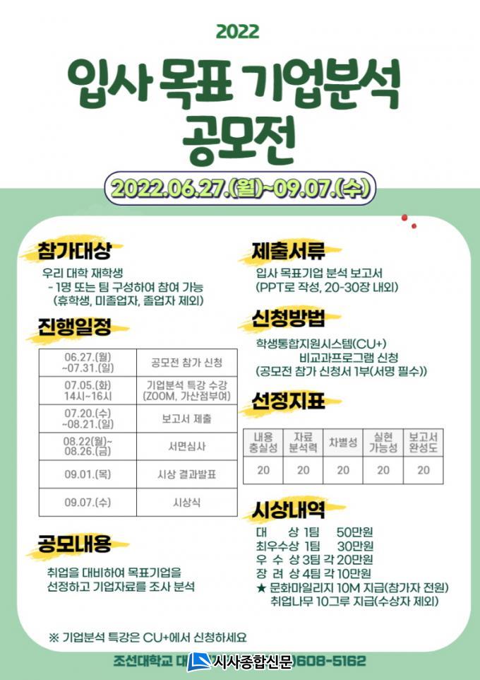 °ø¸ð´ë»óÀº Á¶¼±´ëÇб³ ÀçÇлý(ÈÞÇлý, ¹ÌÁ¹¾÷ÀÚ, Á¹¾÷ÀÚ Á¦¿Ü)À¸·Î 1¸í ¶Ç´Â ÆÀÀ» ±¸¼ºÇØ Âü¿© °¡´ÉÇÏ´Ù. Âü¿©ÀÚ´Â Ãë¾÷¿¡ ´ëºñÇÑ ¸ñÇ¥±â¾÷À» ¼±Á¤ÇÑ ÈÄ ±â¾÷ÀڷḦ Á¶»ç¡¤ºÐ¼®ÇØ ÀԻ縦 À§ÇÑ ¸ñÇ¥´Þ¼º °èȹǥ¸¦ ÀÛ¼ºÇÏ¸é µÈ´Ù. ÀÔ»ç ¸ñÇ¥±â¾÷ º¸°í¼(PPTÀÛ¼º, 20~30Àå ³»¿Ü)¸¦ ÀÛ¼ºÇßÀ¸¸é, 7¿ù 31ÀÏ °ø¸ðÀü Âü°¡ ½Åû ÈÄ 8¿ù 21ÀϱîÁö Á¦ÃâÇϸé ÇÏ¸é µÈ´Ù.