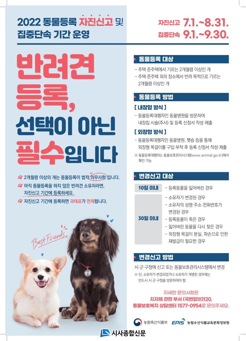 µ¿¹°µî·ÏÀº 2°³¿ù·É ÀÌ»óÀÇ °³´Â ÇʼöÀûÀ¸·Î ÇØ¾ß ÇÑ´Ù. ÀÌ¹Ì µî·ÏÀ» Çß´õ¶óµµ µî·Ï ³»¿ë¿¡ º¯°æÀÌ ÀÖ´Ù¸é Àǹ«ÀûÀ¸·Î º¯°æ ½Å°í¸¦ ÇØ¾ß ÇÏ°í ±ºÃ» ¶Ç´Â µ¿¹°º¸È£°ü¸®½Ã½ºÅÛ¿¡¼ º¯°æ ½Å°í¸¦ ÇÒ ¼ö ÀÖ´Ù. À̸¦ À§¹ÝÇÒ °æ¿ì 100¸¸ ¿ø ÀÌÇÏÀÇ °úÅ·ᰡ ºÎ°úµÈ´Ù. ±×·¯³ª ÀÚÁø½Å°í ±â°£ Áß ÀÚ¹ßÀûÀ¸·Î µ¿¹°µî·ÏÀ» ÇÒ °æ¿ì °úÅ·ᰡ ¸éÁ¦µÈ´Ù.